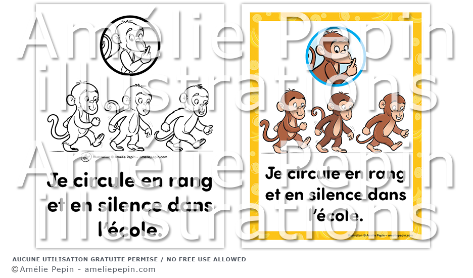 Règle de classe illustrée avec des singes: "Je circule en rang et en silence dans l'école."
