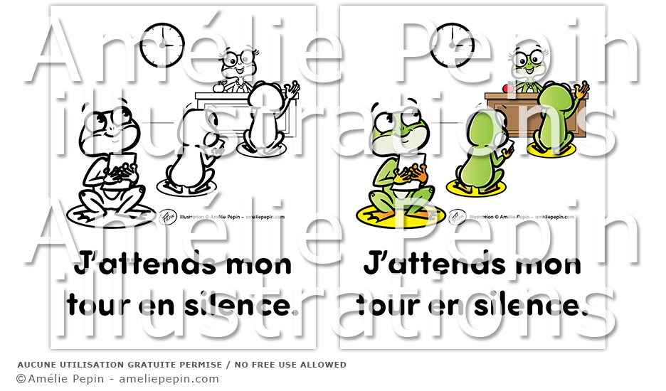 Règle de classe illustrée avec des grenouilles: "J'attends mon tour en silence."
