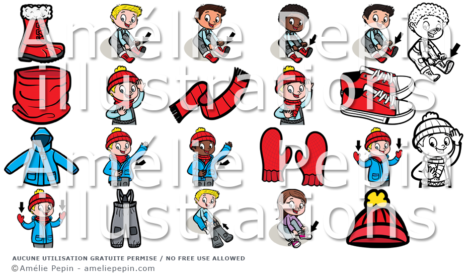 Le dossier contient un garçon qui fait les actions suivantes: je mets mon pantalon de neige, je mets mes bottes, je mets mon bonnet et mon écharpe (foulard et tuque) ou je mets mon bonnet et mon cache-cou, je mets mon manteau, je mets mes mitaines. Une petite fille met ses souliers. Quatre choix de couleurs de peau pour chaque modèle. De plus, le dossier contient: un pantanlon de neige, une botte, un bonnet (une tuque), une écharpe (un foulard), un cache-cou, un manteau, des mitaines, des souliers (roses et rouges).