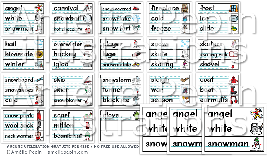 Les mots illustrés sont: angel, white, snowman, carnival, snowball, hot chocolate, snow-covered, snowflake, snow fort, fireplace, cold, freeze, frost, ice, slide, hail, hibernate, winter, overwinter, hockey, igloo, player, luge, snowmobile, snow, skate, skating, skaters, skating rink, shovel, snowboard, snowshoes, cold, skis, skier, snowblower, snowstorm, tunnel, black ice, sleigh, war, season, coat, boot, earmuffs, snow pants, wool sock, neck warmer, scarf, mitten, beanie hat, glove.