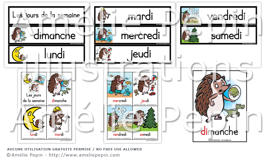Chaque jour de la semaine est représenté par un hérisson avec un élément dont le son débute par la première syllabe du jour (DImanche, DInosaure).