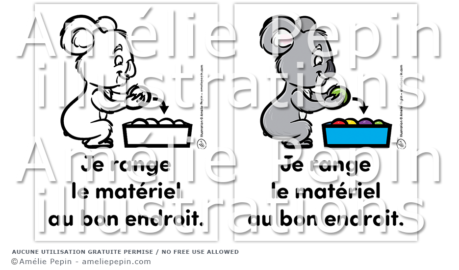 Règle de classe illustrée avec des koalas: "Je range le matériel au bon endroit."