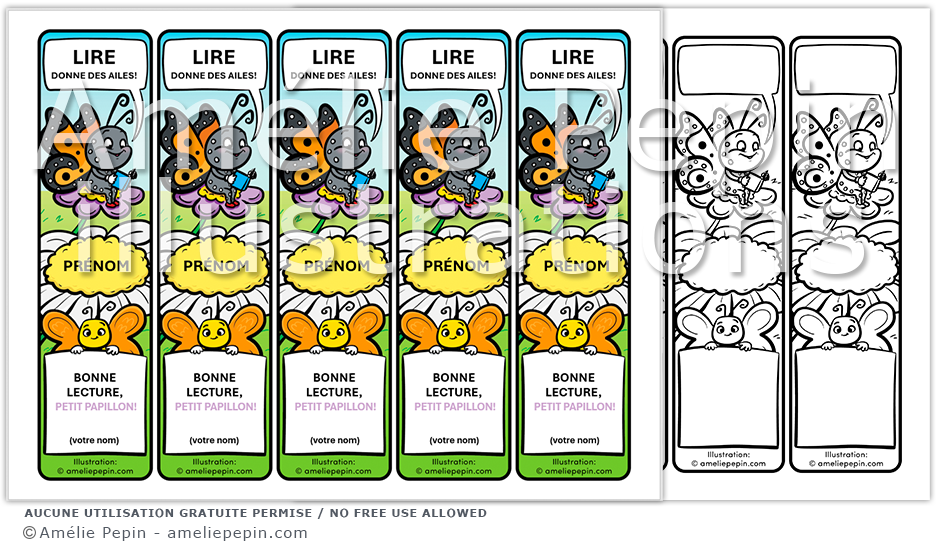 Signets aux coins arrondis illustrés avec un papillon assis sur une fleur qui lit un livre tandis qu'une autre papillon tient un écriteau. Les textes suggérés que vous pouvez changer sur le signet sont: «Lire donne des ailes!» et «Bonne lecture, petit papillon!».
