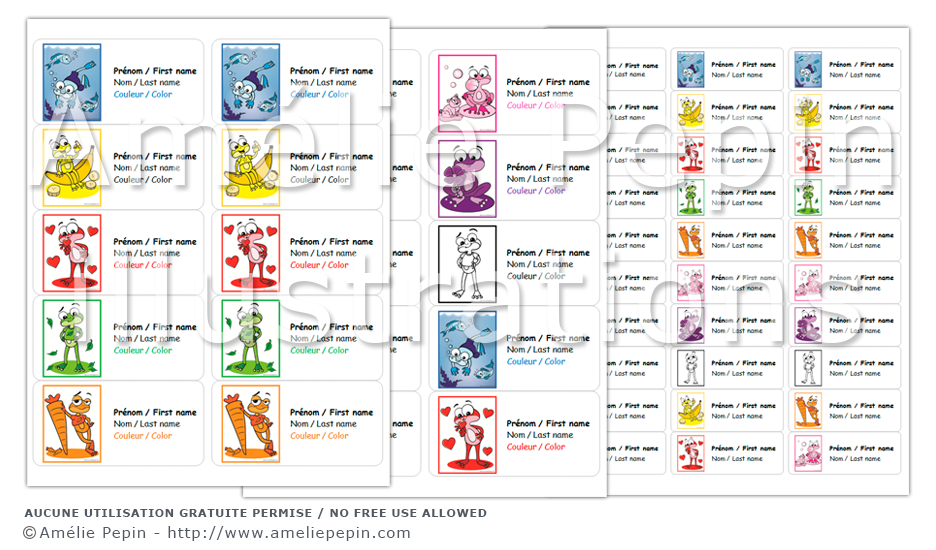 Si vous séparez votre groupe en plusieurs équipes de couleurs, ces étiquettes vous feront sauver du temps pour l'identification de votre matériel. Sous forme de documents Word, vous pouvez insérer le texte de votre choix dans les espaces réservés à cette fin. Il vous suffit alors d'imprimer sur papier Avery 5160 ou 5163 selon le document choisi.