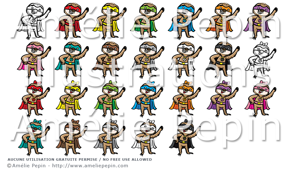 Ce dossier contient des images de paresseux (garçons et filles) en superhéros de différentes couleurs: rouge, jaune, vert, bleu, orange, violet, rose, turquoise, brun, gris, noir et blanc.
