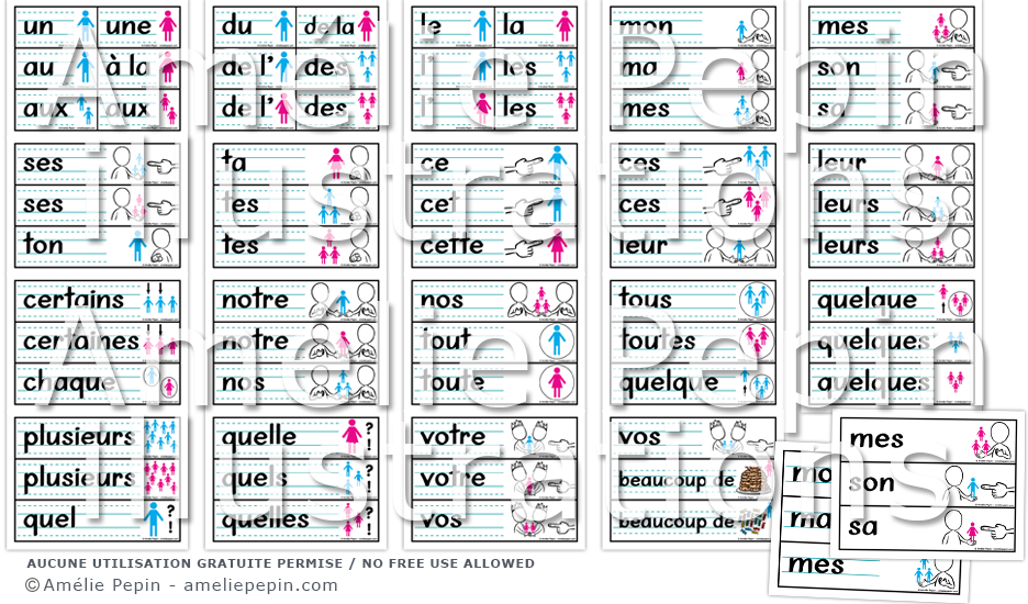 Grands mots-étiquettes pour illustrer les déterminants en fonction de leur genre et de leur nombre (masculin, féminin, singulier, pluriel): un, une, au, aux, à la, du, de, de la, de l' des, le ,la, l', les, mon, ma, mes, son, sa ,ses, ton, ta, tes, ce, cet, cette, ces, leur, leurs, certains, certaines, chaque, notre, nos, votre, vos, tout, toute, tous, toutes, quelque, quelques, plusieurs, quel, quelle, quels, quelles, beaucoup de. Les personnages sont illustrés avec une couronne sur la tête pour les déterminants "votre, vos", car ils peuvent aussi être utilisés au singulier par respect (politesse).