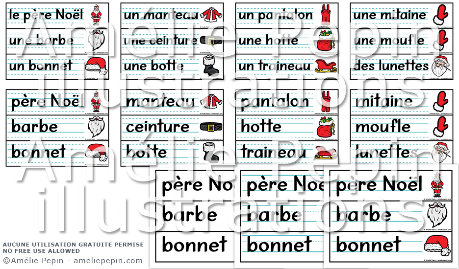 Grands mots-étiquettes pour apprendre le vocabulaire en lien avec le père Noël (12 mots sont illustrés). Quatre versions sont incluses: sans ligne, avec lignes trottoirs, lignes doubles ou lignes calligraphiques.