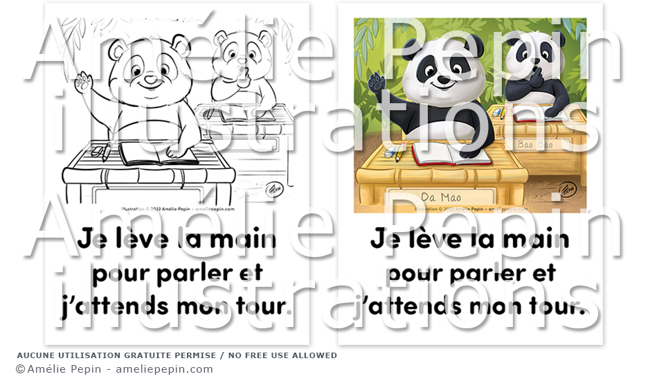 Règle de classe illustrée avec des pandas assis au bureau: "Je lève la main pour parler et j'attends mon tour."