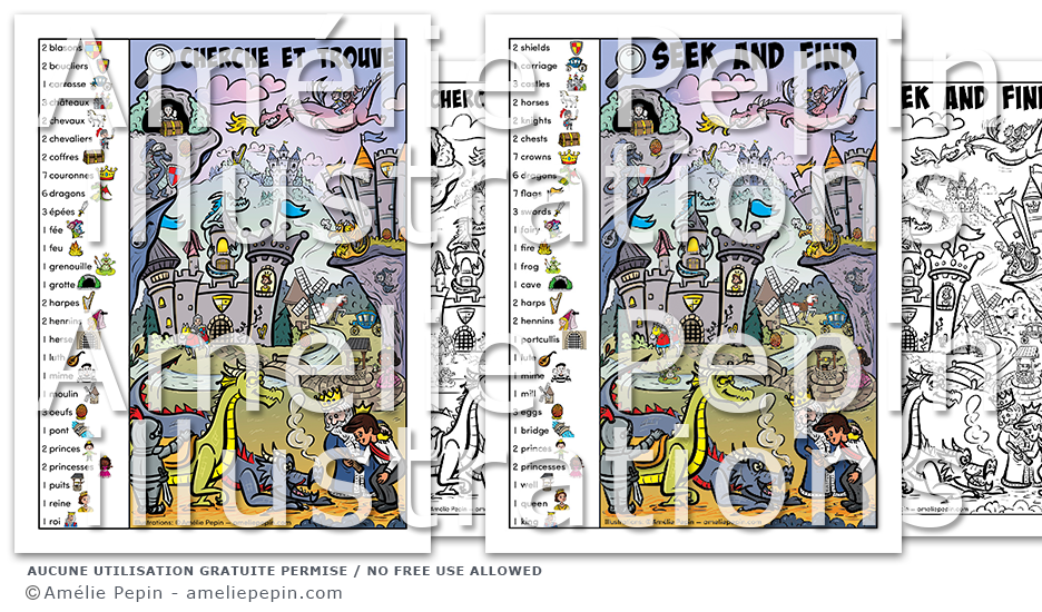 L'enfant cherche et trouve les éléments de la liste dans l'illustration. Les éléments à trouver sont illustrés pour aider l'enfant à apprendre leur nom. C'est un jeu qui développe le sens de l'observation, la concentration et le vocabulaire. L'enfant compte également les éléments jusqu'à sept. Un univers fantaisiste avec des châteaux, des dragons, des chevaliers, des princes et des princesses, une reine et un roi. Une version en noir et blanc est incluse et n'attend qu'à être coloriée!