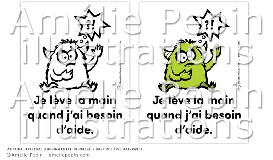 Règle de classe illustrée avec un monstre: "Je lève la main quand j'ai besoin d'aide."