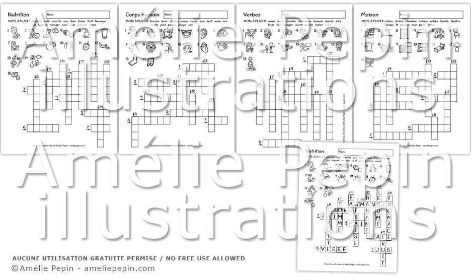 Chaque image correspond à un numéro dans la grille. L'enfant écrit le mot qui est illustré au bon endroit. La liste des mots à placer est écrite pour aider l'élève. Les thèmes de ces mots croisés (ou mots fléchés) sont: nutrition (alimentation), corps humain, maison et verbes.