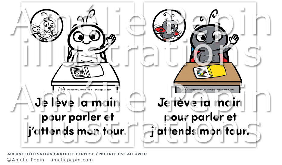 Règle de classe illustrée avec une coccinelle assise au bureau: "Je lève la main pour parler et j'attends mon tour."