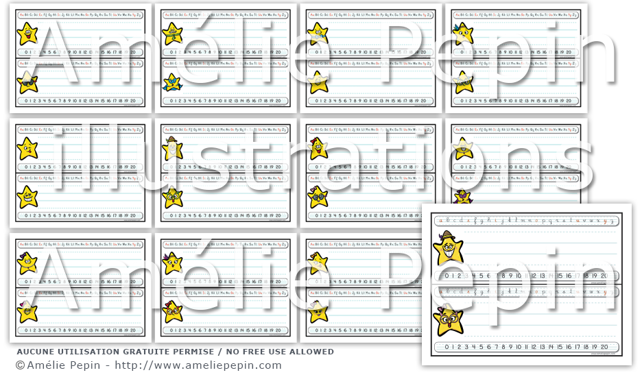 Chaque étiquette contient les lettres de l'alphabet en cursive avec les voyelles écrites en rouge, un trottoir pour écrire le prénom de l'enfant ainsi que les nombres de 0 à 20. La version PowerPoint vous permet d'écrire le nom de l'enfant à l'ordinateur (il n'y a pas de trottoir dans cette version). Assurez-vous d'avoir le logiciel Microsoft PowerPoint installé sur votre ordinateur pour ouvrir cette version.