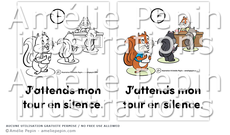 Règle de classe illustrée avec des écureuils: "J'attends mon tour en silence."