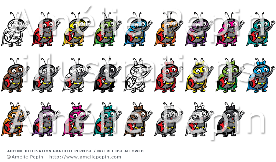 Ce dossier contient des images de coccinelles (garçons et filles) en superhéros de différentes couleurs: rouge, jaune, vert, bleu, orange, violet, rose, turquoise, brun, gris, noir et blanc.