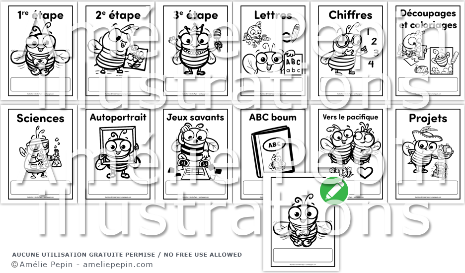Voici 12 pages couvertures illustrées avec des abeilles pour identifier les Duo-tangs ou les cahiers. Les titres écrits en français dans la version PDF sont: 1re étape, 2e étape, 3e étape, Autoportrait, Chiffres, Découpages et coloriages, Sciences, Lettres, Jeux savants, ABC boum, Vers le pacifique et Projets.