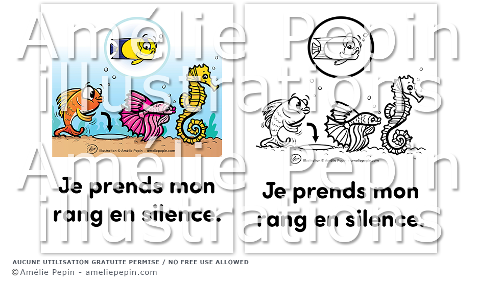 Règle de classe illustrée avec des poissons et un hippocampe: "Je prends mon rang en silence."