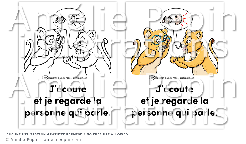 Règle de classe illustrée avec des lionceaux: "J'écoute et je regarde la personne qui parle."