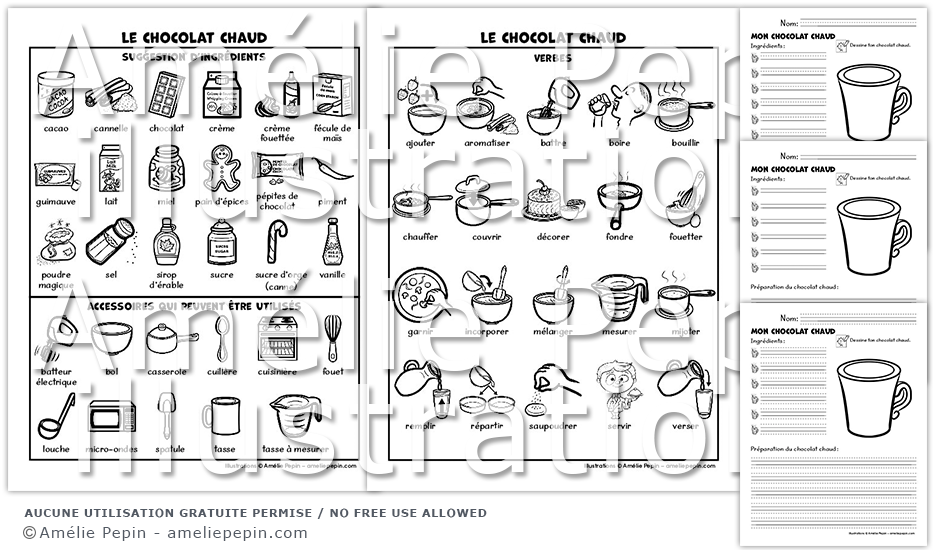 - Page 1: Une suggestion d'ingrédients illustrés ainsi que les accessoires qui peuvent être utilisés pour la préparation du chocolat chaud.