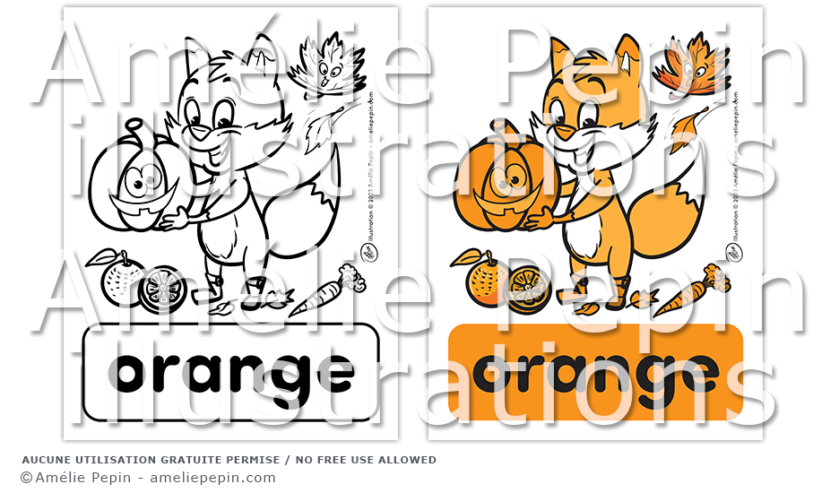 Sur cette affiche, un renard est entouré d'éléments de couleur orange: citrouille, orange, carotte, feuille d'automne. Une version à colorier de l'affiche est également incluse pour apprendre la couleur ou pour représenter le thème de l'automne.