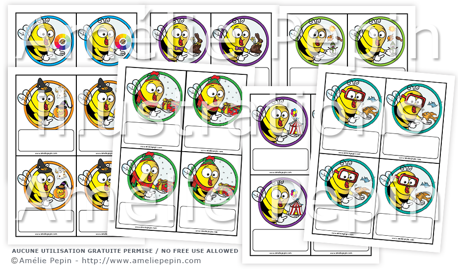 Ensemble de 25 mérites de l'abeille, illustrant les thèmes suivants: les pommes, la météo, les couleurs, la famille, la maison, les saisons, Halloween, le corps humain, Noël, les animaux polaires, la Saint-Valentin, Pâques, le Moyen Âge, le cirque, les contes, les dinosaures, l'espace et les planètes, la ferme, la mer, les métiers, les pirates, les sports, les insectes et les bestioles, 100 jours, réussite de son année.