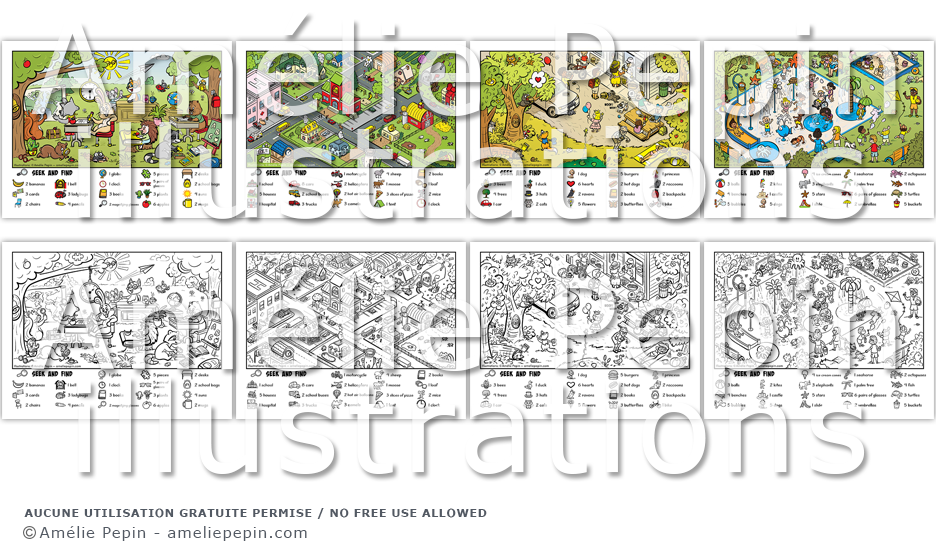 L'enfant cherche et trouve les éléments de la liste dans l'illustration. Il peut aussi colorier les versions en noir et blanc. Les thèmes suivants sont illustrés: une classe en forêt, la ville, le casse-croûte et les jeux d'eau.