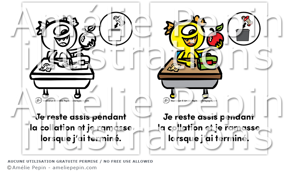 Règle de classe illustrée avec un monstre: "Je reste assis pendant la collation et je ramasse lorsque j'ai terminé."