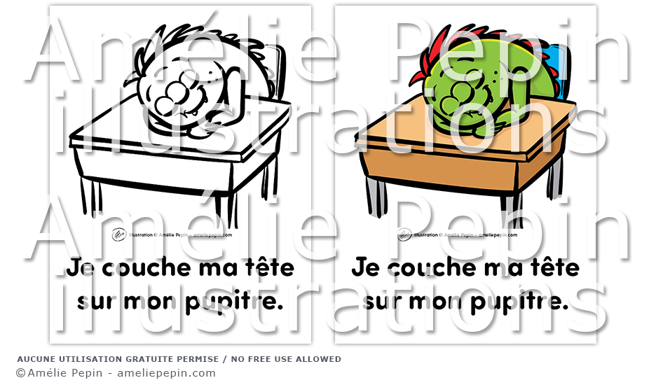 Règle de classe illustrée avec un monstre: "Je couche ma tête sur mon pupitre."