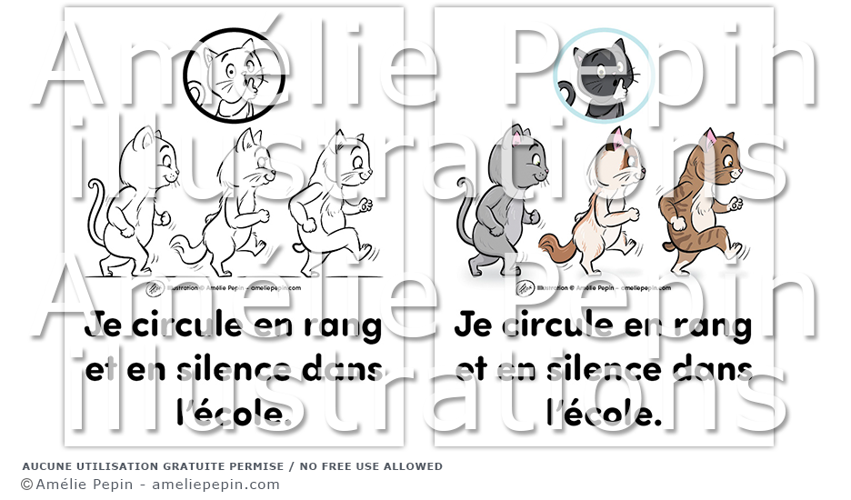 Règle de classe illustrée avec des chats: "Je circule en rang et en silence dans l'école."