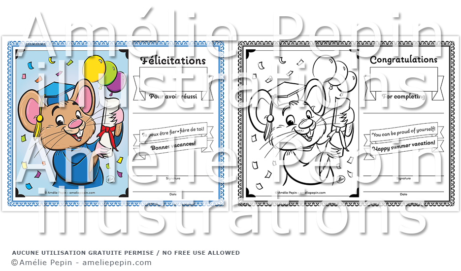 Récompensez la réussite d'une année scolaire complétée avec ce joyeux diplôme de souris! Les informations à compléter doivent être écrites à la main.