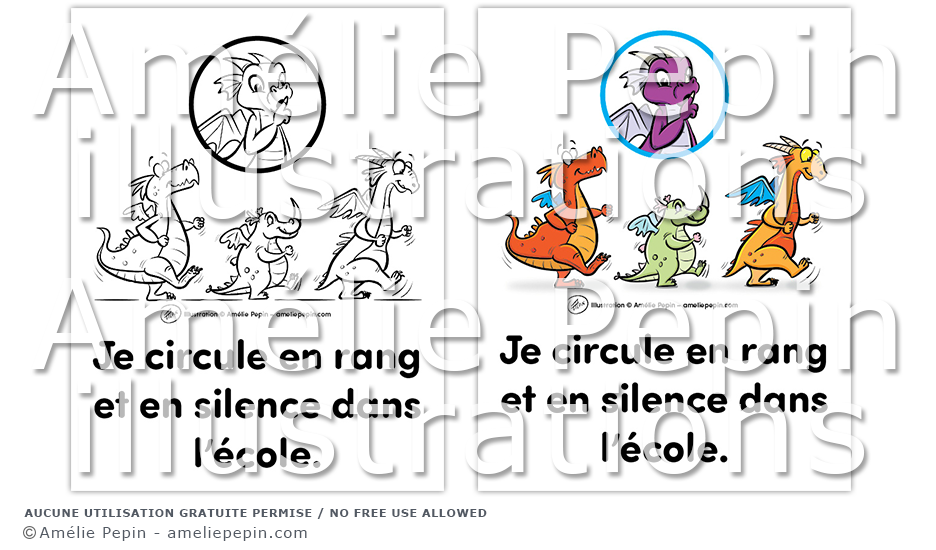 Règle de classe illustrée avec des dragons: "Je circule en rang et en silence dans l'école."