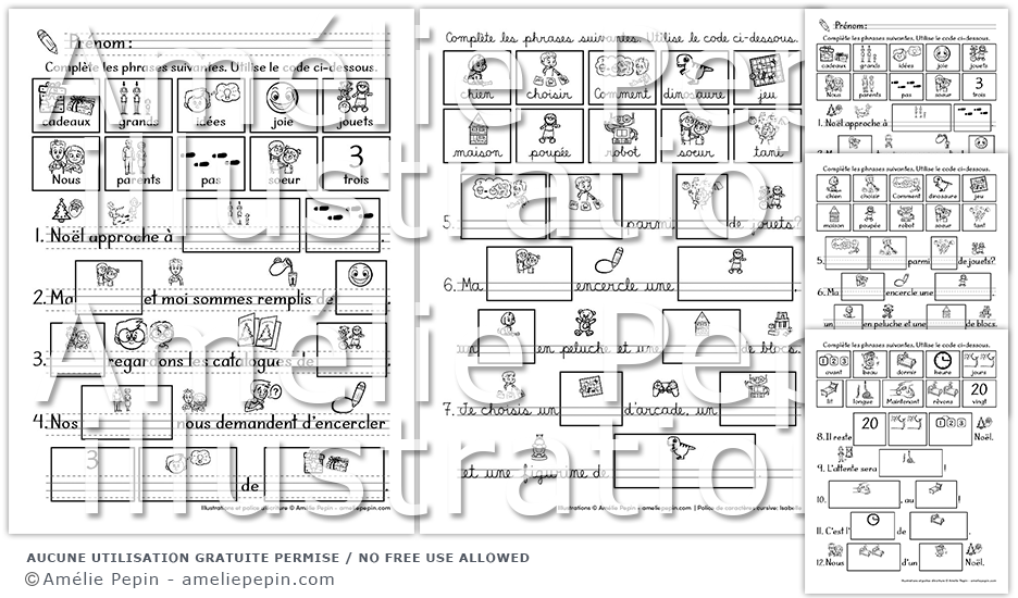 L'enfant complète les douze phrases en copiant les mots illustrés. Les mots à copier sont: cadeaux, grands, idées, joie, jouets, Nous, parents, pas, soeur, trois, chien, choisir, Comment, dinosaure, jeu, maison, poupée, robot, tant, avant, beau, dormir, heure, jours, lit, longues, Maintenant, rêvons, vingt.