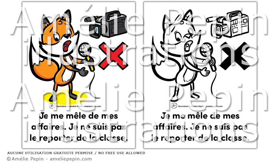 Règle de classe illustrée avec un renard: "Je me mêle de mes affaires. Je ne suis pas le reporter de la classe."