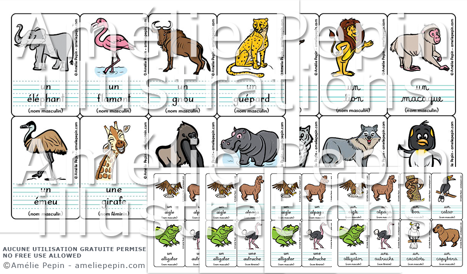 Les mots illustrés sont: aigle, alligator, alpaga, autruche, boa, cacatoès, calao, capybara, chameau, chinchilla, condor, cygne, dendrolague, diable de Tasmanie, dragon de Komodo, éland du Cap, éléphant, émeu, flamant, girafe, gnou, gorille, guépard, hippopotame, kangourou, koala, lama, léopard, lion, loup, macaque, manchot, otarie, ours, panda, panda roux, paresseux, pélican, perroquet, serpent, rhinocéros, singe, suricate, tigre, tortue, toucan, vautour, wallaby, yack, zèbre, zoo.