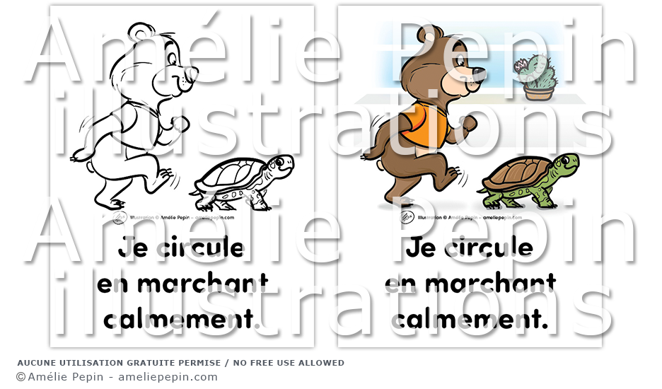 Règle de classe illustrée avec un ours et une tortue: "Je circule en marchant calmement."