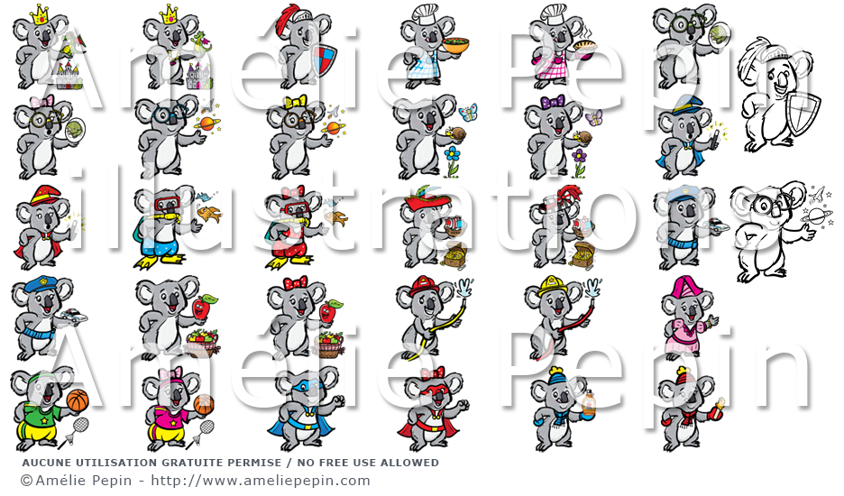Ce dossier contient des images de koalas pour illustrer les thèmes suivants: les châteaux, l'alimentation, les dinosaures, l'espace et les planètes, les insectes, la magie, la mer, les pirates, la sécurité (policiers), les pommes, les pompiers, les sports, les superhéros et le temps des sucres.