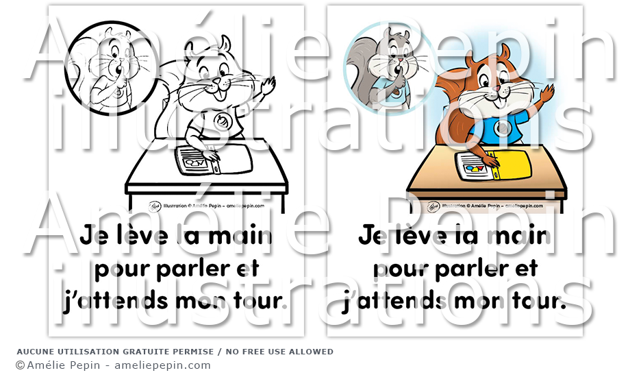 Règle de classe illustrée avec un écureuil assis au bureau: "Je lève la main pour parler et j'attends mon tour."