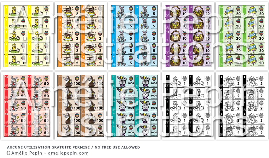 Ces documents contiennent les billets de 1$, 2$, 5$, 10$, 20$, 50$,100$ et 1000$. Sauvez de l'encre en imprimant la version en noir et blanc sur du papier teinté.