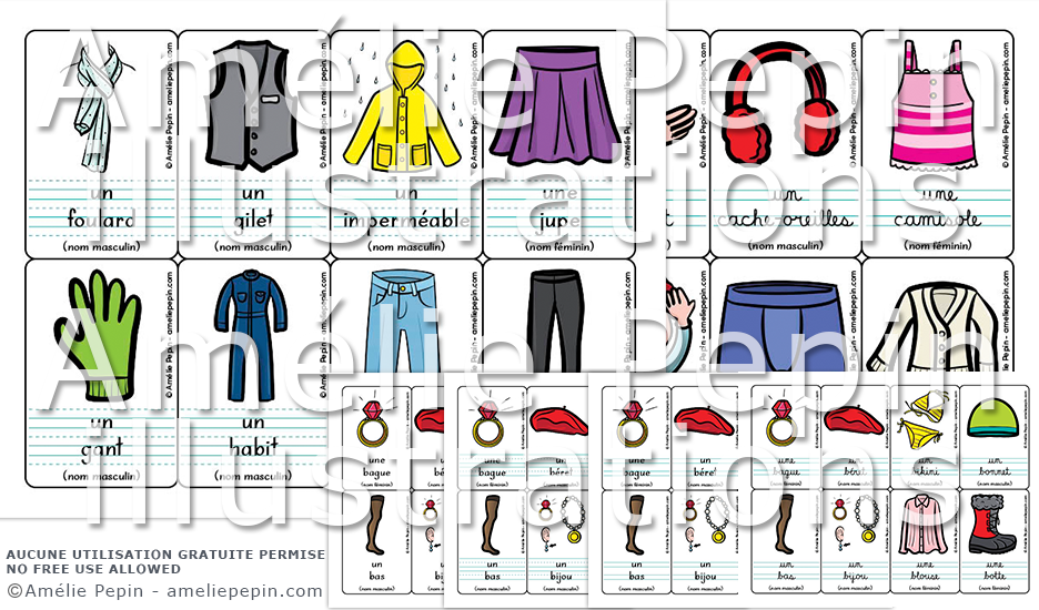 Les mots illustrés sont: bague, bas, béret, bermuda, bijou, bikini, blouse, bonnet, botte, boucle d'oreille, boxeur, bracelet, cache-cou, cache-oreilles, caleçon, camisole, cardigan, casque, casquette, ceinture, chandail, chapeau, chaussette, chaussure, chemise, collant, collier, complet, costume, cravate, culotte, écharpe, espadrille, foulard, gant, gilet, habit, imperméable, jean, jupe, legging, lunettes, maillot, manteau, mitaine, moufle, montre, noeud papillon, pantalon, pantoufle, parapluie, peignoir, portefeuille, pull, pyjama, robe, sac, salopette, sandale, short, slip, soulier, sous-vêtement, soutien-gorge, toge, toque, t-shirt, tuque, uniforme, veste, veston, vêtement, s'habiller, porter.