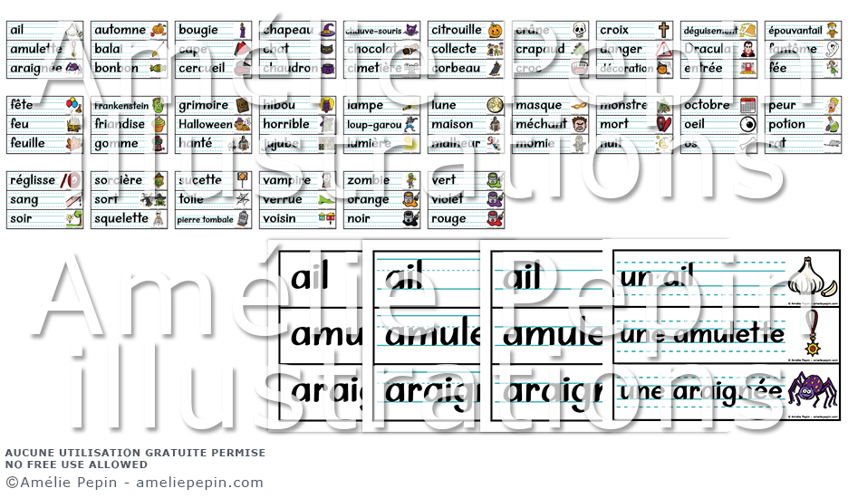 Les mots illustrés sont: ail, amulette, araignée, automne, balai, bonbon, bougie, cape, cercueil, chapeau, chat, chaudron, chauve-souris, chocolat, cimetière, citrouille, collecte, corbeau, crâne, crapaud, croc, croix, danger, décoration, déguisement, Dracula, entrée, épouvantail, fantôme, fée, fête, feu, feuille, Frankenstein, friandise, gomme, grimoire, Halloween, hanté, hibou, horrible, jujube, lampe, loup-garou, lumière, lune, maison, malheur, masque, méchant, momie, monstre, mort, nuit, octobre, oeil, os, peur, potion, rat, réglisse, sang, soir, sorcière, sort, squelette, sucette, toile, pierre tombale, vampire, verrue, voisin, zombie. orange, noir, vert, violet, rouge.