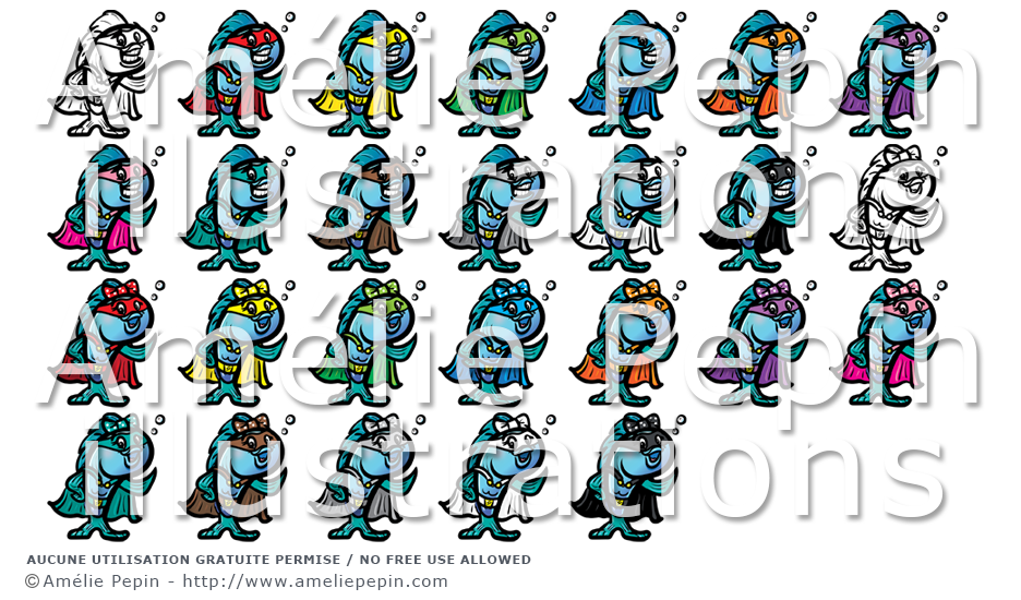 Ce dossier contient des images de poissons (garçons et filles) en superhéros de différentes couleurs: rouge, jaune, vert, bleu, orange, violet, rose, turquoise, brun, gris, noir et blanc.