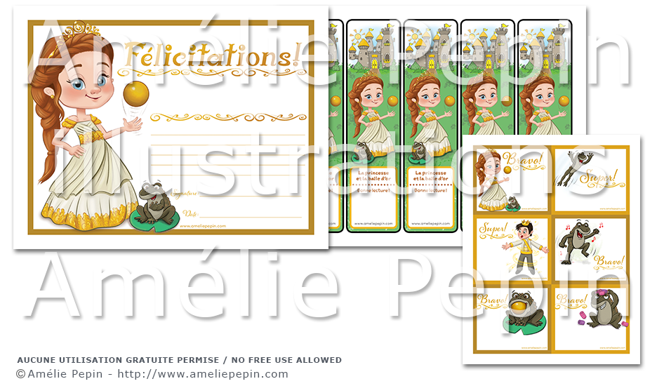 Le dossier contient un diplôme, une page de mérites ainsi qu'une page de signets au thème du conte La princesse et la balle d'or. La version Microsoft Word vous permet d'inscrire à l'ordinateur le prénom des enfants et un court texte (j'ai utilisé par défaut la police d'écriture Comic Sans puisqu'elle est universelle, mais je vous suggère d'utiliser la police d'écriture de votre choix). Quant aux fichiers PDF, ils sont prêts pour l'impression et vous devrez ajouter votre texte à la main si vous utilisez cette version.