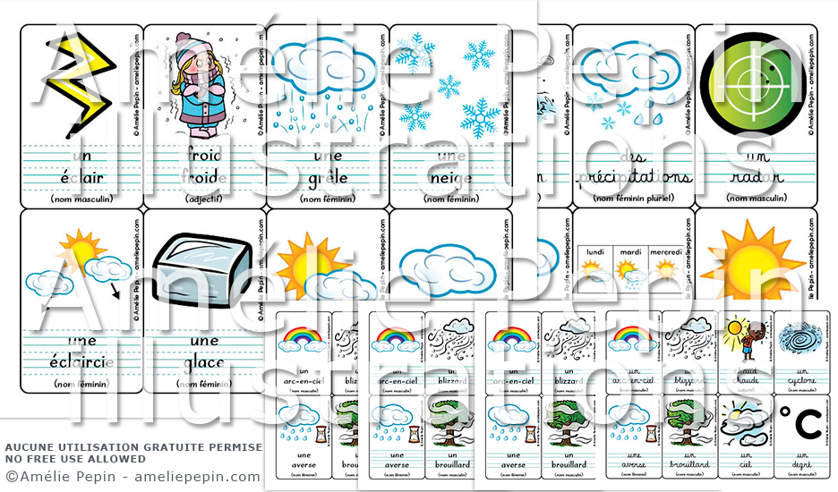 Les mots illustrés sont: arc-en-ciel, averse, blizzard, brouillard, chaud, ciel, cyclone, degré, éclair, éclaircie, froid, glace, grêle, météo, neige, nuage, nuageux, orage, ouragan, pluie, précipitations, prévision, radar, soleil, température, tempête, thermomètre, tonnerre, tornade, typhon, vent, verglas.