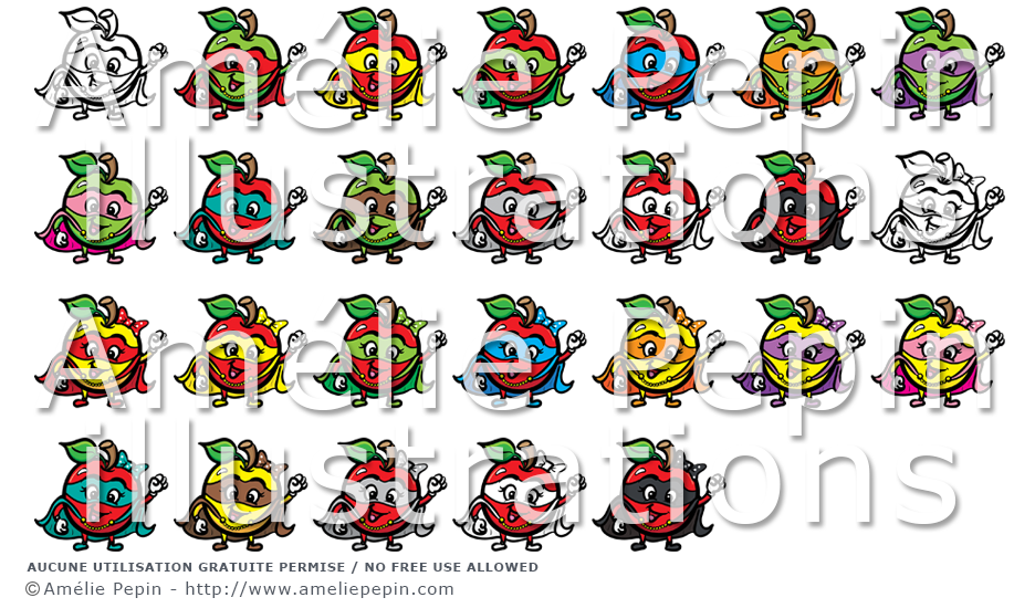 Ce dossier contient des images de pommes (garçons et filles) en superhéros de différentes couleurs: rouge, jaune, vert, bleu, orange, violet, rose, turquoise, brun, gris, noir et blanc.
