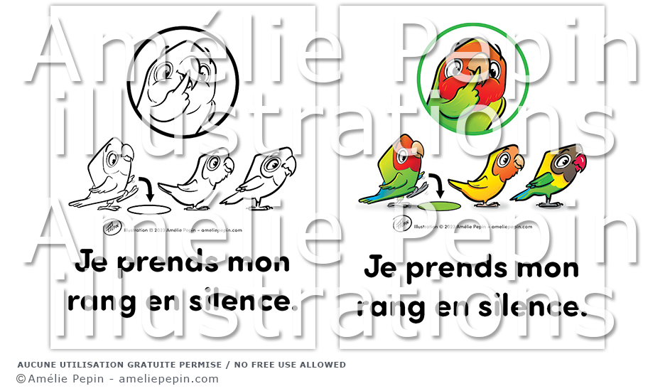 Règle de classe illustrée avec des inséparables: "Je prends mon rang en silence."