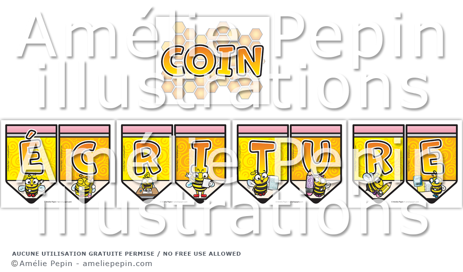 Créez un bel affichage pour votre coin écriture avec cette banderole illustrée avec des abeilles. Chaque page contient deux fanions en forme de crayon. Chaque fanion mesure environ 7,5 po de hauteur sur 4,9 po de largeur. Découpez chaque lettre et collez-les à votre mur, ou encore, conservez une bande blanche au-dessus du fanion lorsque vous découpez ceux-ci pour pouvoir plier cette partie sur une corde à suspendre. De plus, une page contient le mot "coin" à découper en un seul morceau.