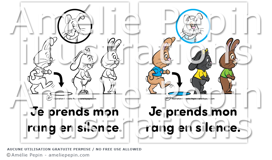 Règle de classe illustrée avec des lapins: "Je prends mon rang en silence."
