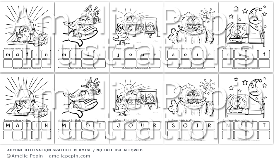 Cinq moments de la journée à colorier, illustrés avec des inséparables. En bas de page, l'enfant peut s'exercer à écrire les lettres des mots: matin, midi, jour, soir et nuit.