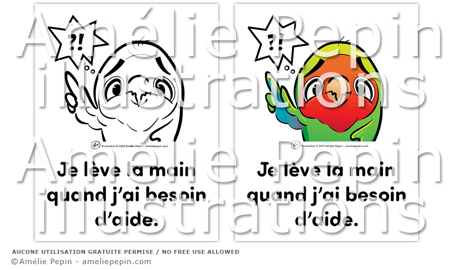 Règle de classe illustrée avec un inséparable: "Je lève la main quand j'ai besoin d'aide."