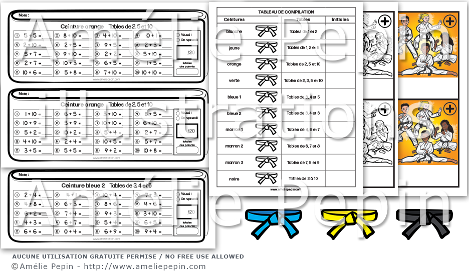 L'enfant exerce ses tables d'addition de 1 à 10. Son but est de réussir à compléter chaque ceinture de math karaté (ceinture blanche à noire). Chaque feuille contient 2 ceintures du même niveau dont les équations sont différentes. Aussi inclus: tableau de compilation en noir et blanc (1 page) , mérites en couleurs et en noir et blanc (1 page), 7 pictogrammes de ceintures de karaté en couleurs.